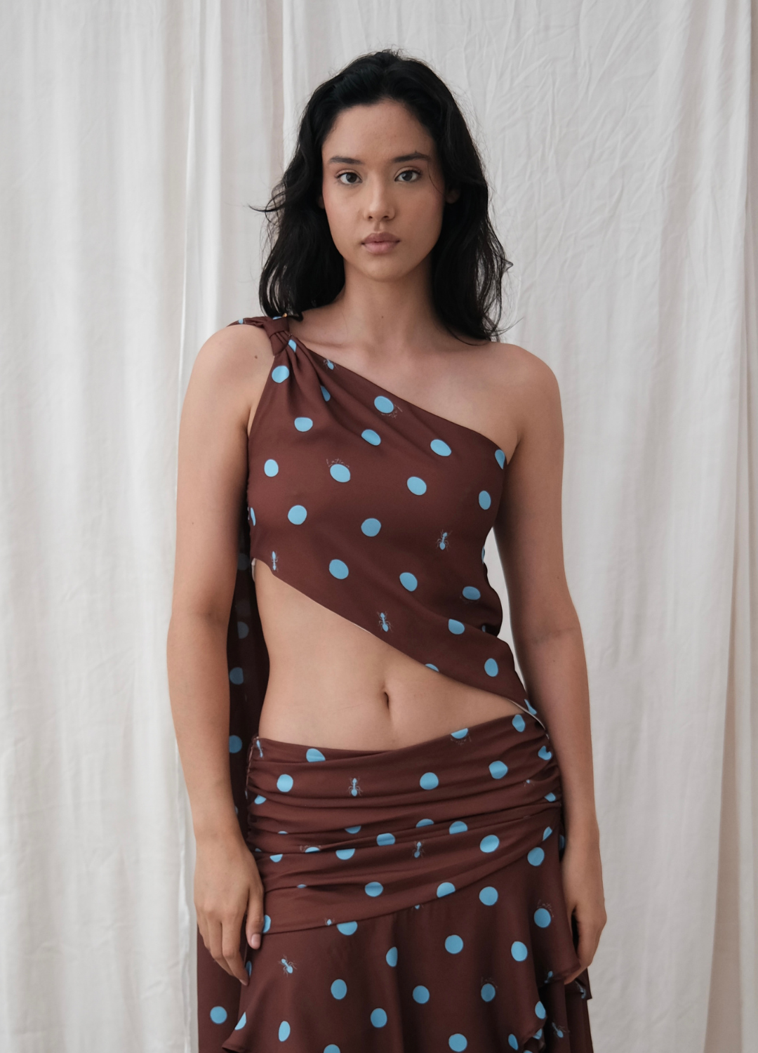 Elaborado en chiffon ligero y sofisticado, Thalía es una blusa que celebra la feminidad con un aire elegante y atrevido. Su diseño asimétrico con cut-outs estratégicos resalta la silueta de manera delicada, mientras que el estampado de lunares aporta un encanto clásico con un giro moderno. La caída fluida de la falda otorga movimiento y frescura, convirtiéndolo en una pieza perfecta para ocasiones especiales