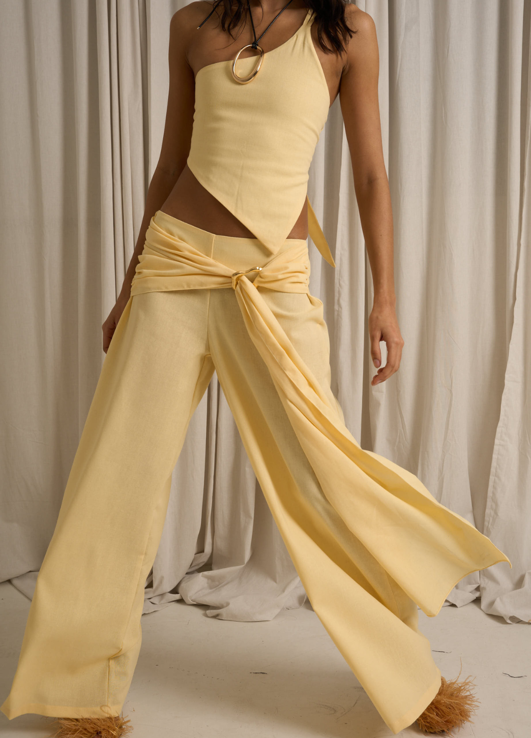 A gold buckle detail at the front, paired with subtle draping, adds a distinctive touch that channels a relaxed yet polished attitude.