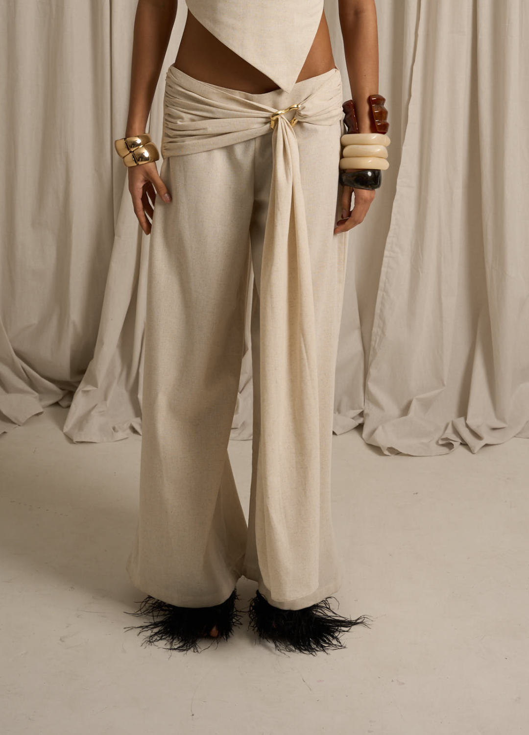 With a fluid silhouette and effortlessly sophisticated feel, these low-rise pants in natural linen redefine contemporary elegance.