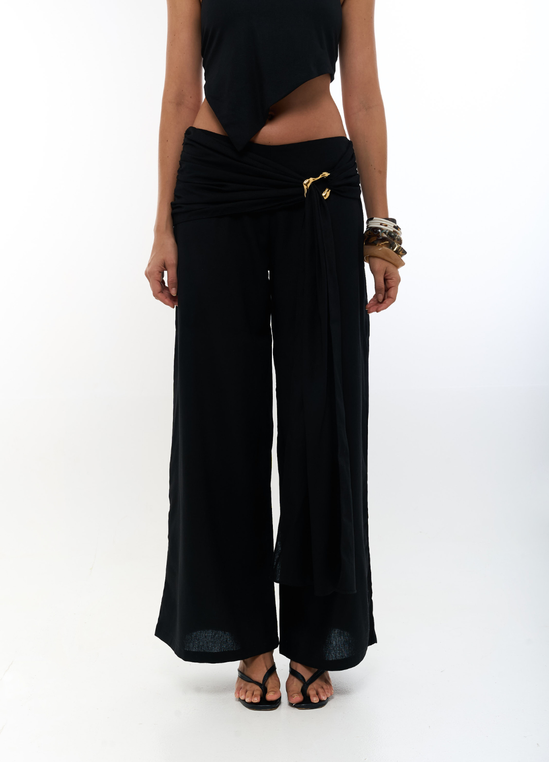 The asymmetrical blouse stands out with its wraparound silhouette, adding movement and a contemporary touch—perfect for those seeking a balance between classic and modern. It’s paired with relaxed-fit pants featuring a wide waistband and a buckle detail that subtly accentuates the waist.