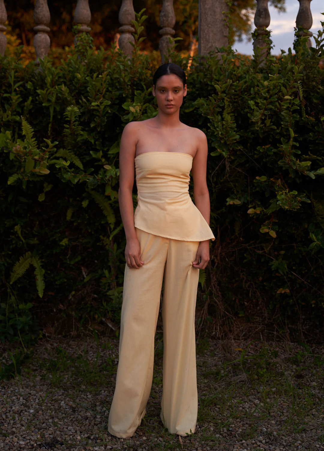 The Yellow Florian Set radiates freshness and elegance with a draped strapless top and wide-leg pants. Its soft tone and asymmetrical cut flatter effortlessly—perfect for occasions where you want to stand out with natural sophistication and a hint of brightness.