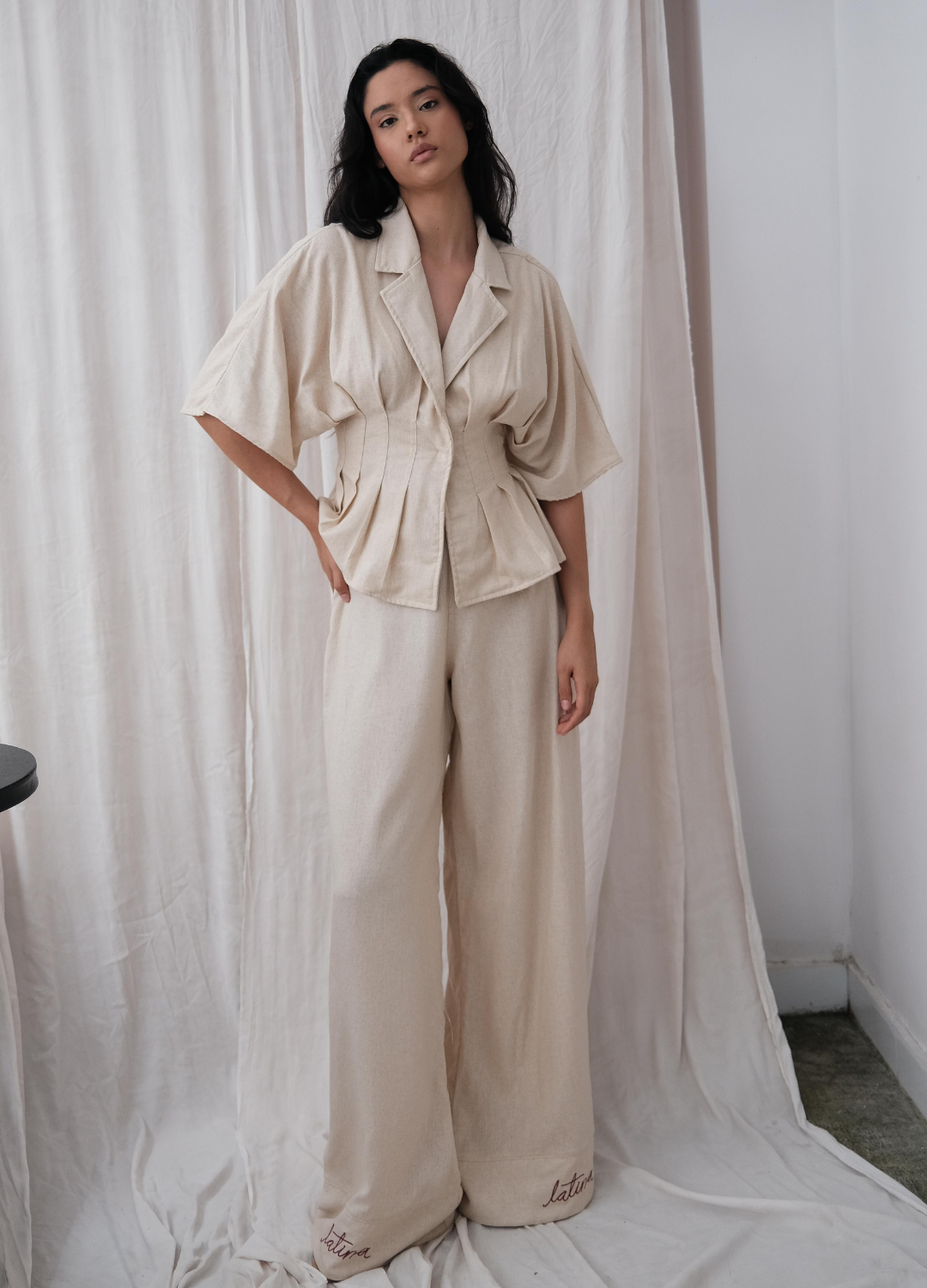 Confeccionado en lino, el set Gaviota combina frescura, elegancia y tradición artesanal. Su silueta de cuadros relajadas aporta comodidad y sofisticación, mientras que los detalles bordados a mano en la espalda de la camisa y en la bota del pantalón realzan su carácter único.