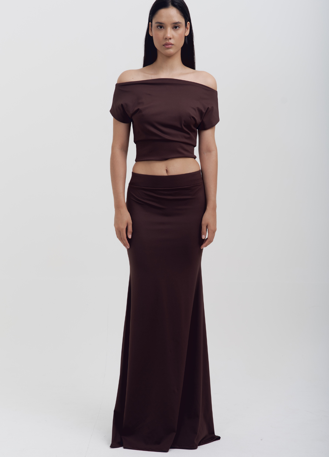 A set that fuses sensuality and elegance with flawless design. The off-shoulder top highlights the neckline with a sophisticated touch, while the long, flowing skirt elongates the silhouette with graceful movement.