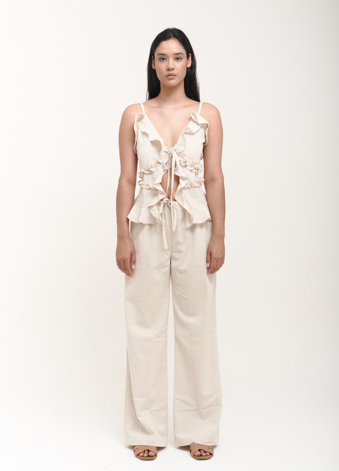 Natural lightness with a romantic flair. The Sand Santander Set is crafted from soft, breathable linen—perfect for warm climates. The ruffled blouse with a front tie adds a feminine, laid-back touch, while the high-waisted pants with an elastic waistband comfortably adapt to your shape.