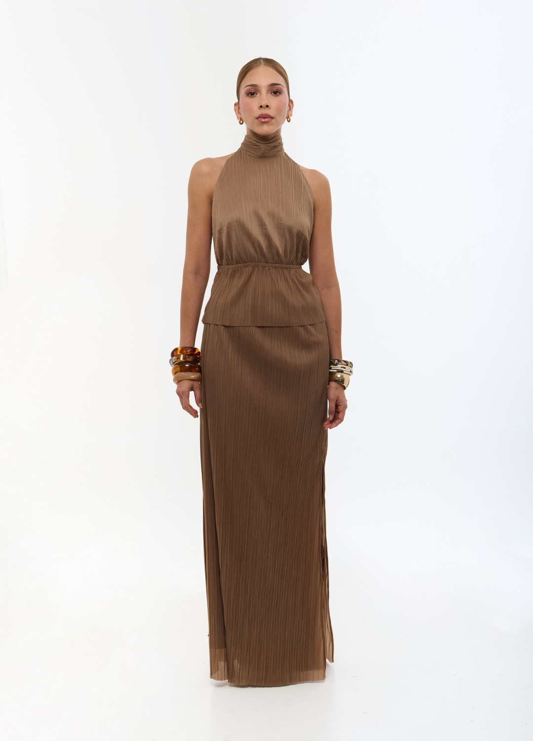 The streamlined silhouette, with a cinched waist and fine pleats, subtly flatters the figure, adding movement and sophistication to every step. Its neutral tone makes it a versatile option—perfect for intimate gatherings, formal dinners, or special moments where style should speak for itself.