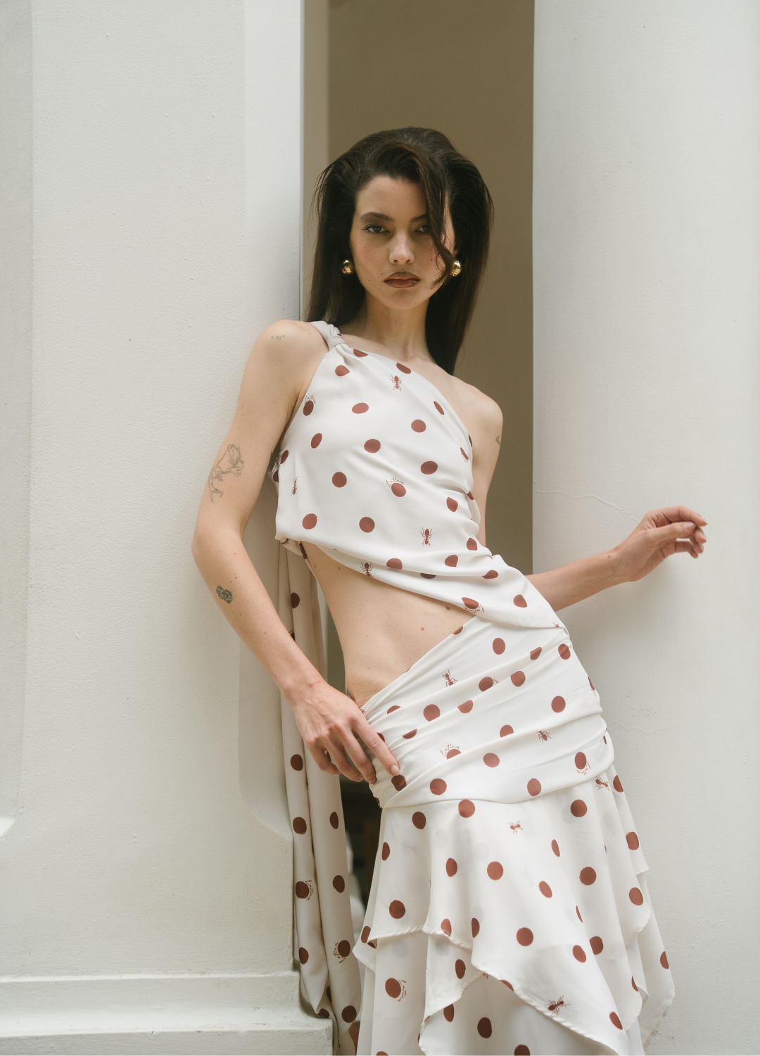 Elaborado en chiffon ligero y sofisticado, Thalía es un set que celebra la feminidad con un aire elegante y atrevido. Su diseño asimétrico con cut-outs estratégicos resalta la silueta de manera delicada, mientras que el estampado de lunares aporta un encanto clásico con un giro moderno. La caída fluida de la falda otorga movimiento y frescura, convirtiéndolo en una pieza perfecta para ocasiones especiales